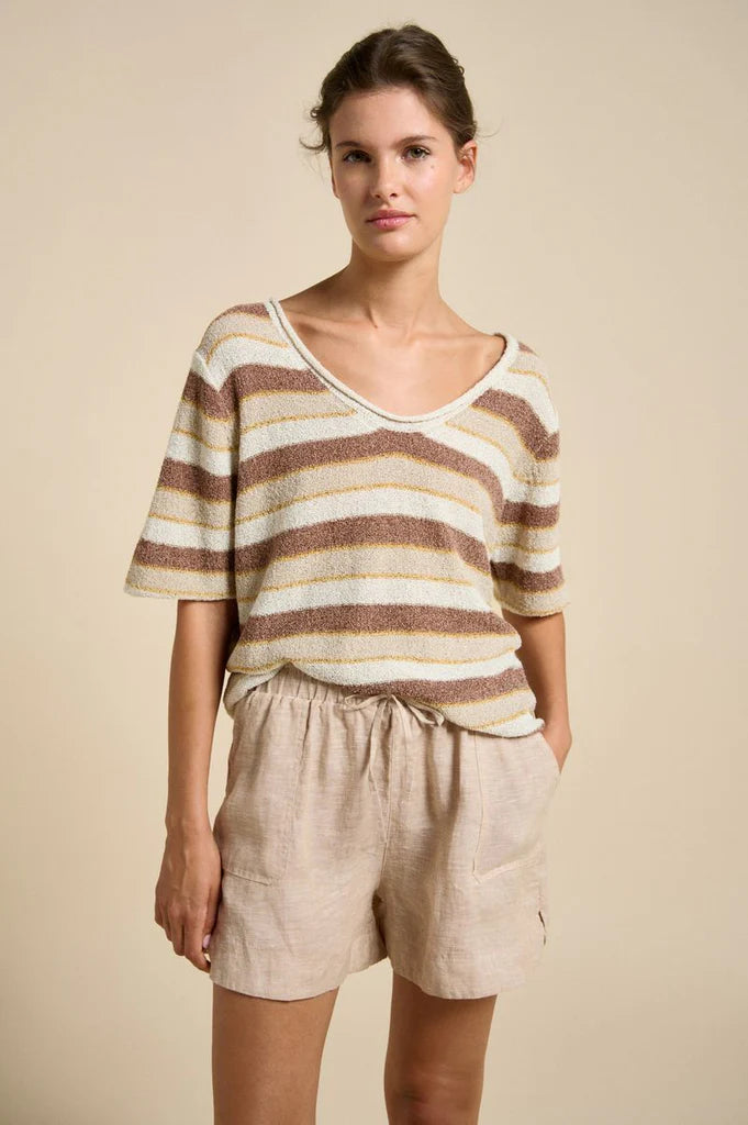 Experience effortless style with the Clovelly Tee by Little Lies. It's warm neutral stripes and textured fabric create a unique look, while the scoop neckline and relaxed fit ensure all-day comfort. Elevate your casual wardrobe with this timeless piece that combines classic design with coastal appeal.