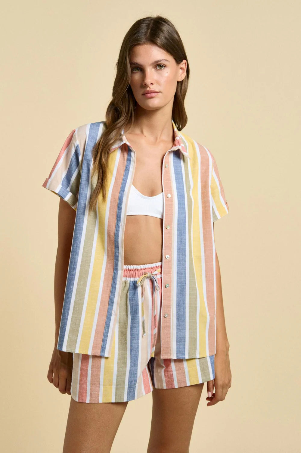 The Sofie Shirt from Little Lies delivers understated sophistication through its thoughtfully designed striped pattern and relaxed construction. Featuring a classic button-up silhouette with short sleeves, structured collar, and strategically placed high-low hem with subtle split, this piece prioritises both form and function. The oversized fit ensures unrestricted movement and all-day wearability, while the 100% cotton composition provides superior breathability—essential for warm climates. Sun-washed stripes in yellow, pink, blue and white create visual interest without overwhelming the palette, making it equally suited to casual summer days, weekend leisure or coastal settings. Layer it with the coordinating Sofie Shorts for a cohesive look, white luxe pants or the coral Spring Tank.