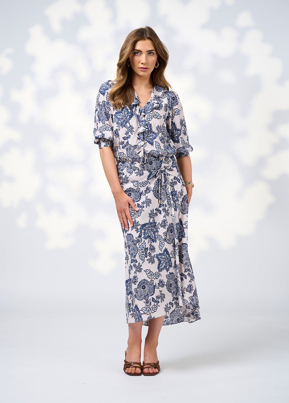 Printed blouse in a silk blend with flounce detail around neckline and through front. Sleeves softly gather into half shirred elasticated cuffs. Featuring bust darts and side splits for the perfect fit.