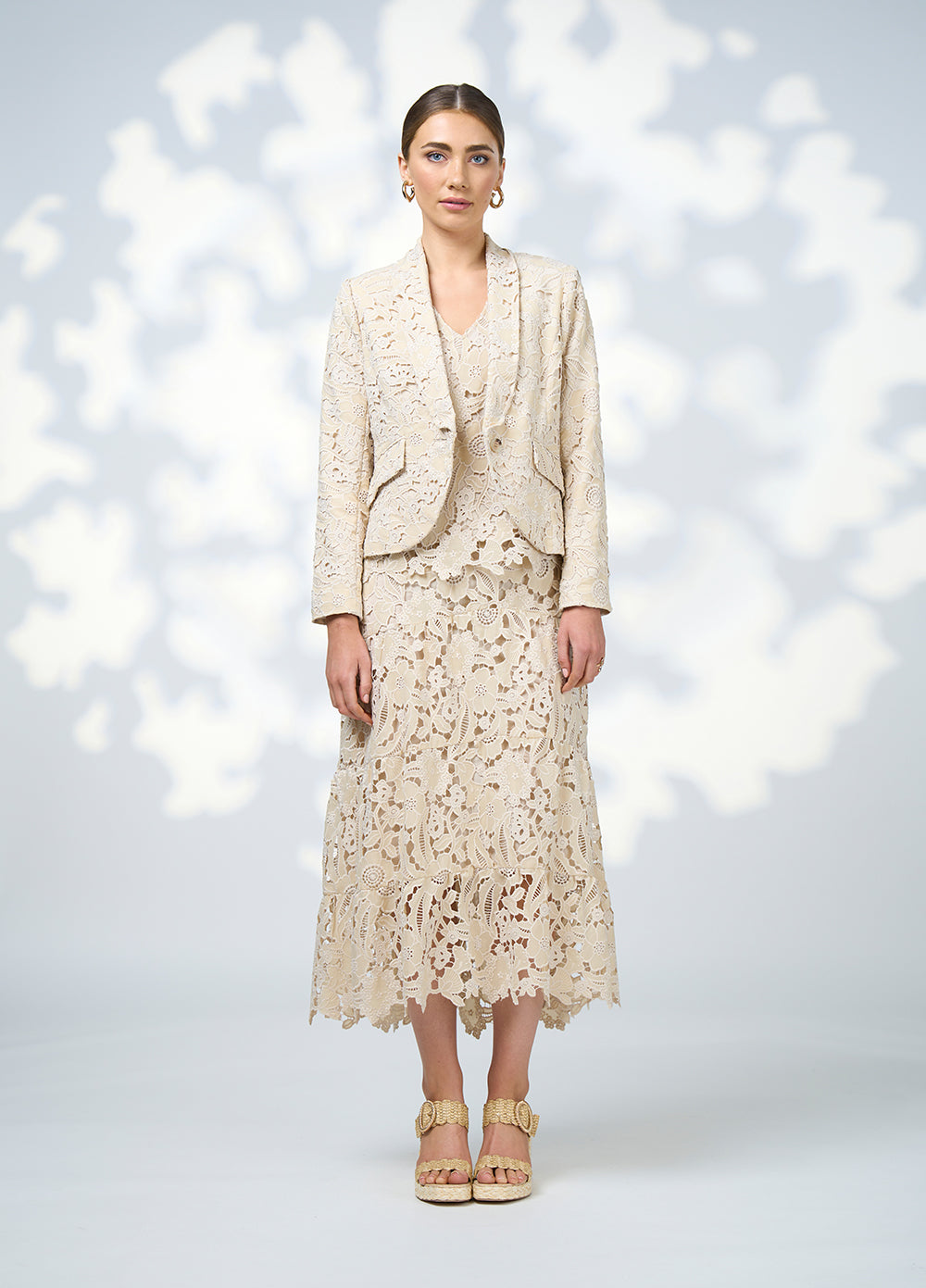 Tiered lace skirt with a softly shaped, scalloped hemline. Featuring a figure flattering basque with an elasticated back waist and zip for ease. Fully Lined.