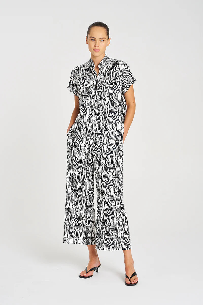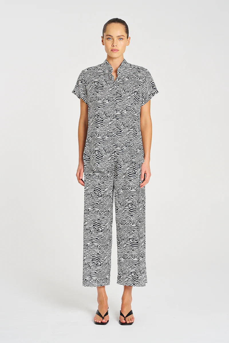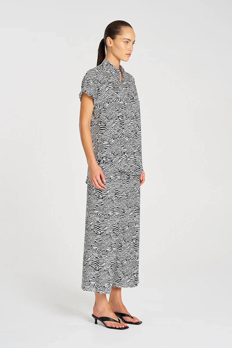 Crafted with Mela Purdie’s smooth fluid stretch Charmeuse fabrication in the classic geometrical Terrain Print. The Stand Shirt features a stand collar and a curved hemline. This is a timeless silhouette to wear day to night.