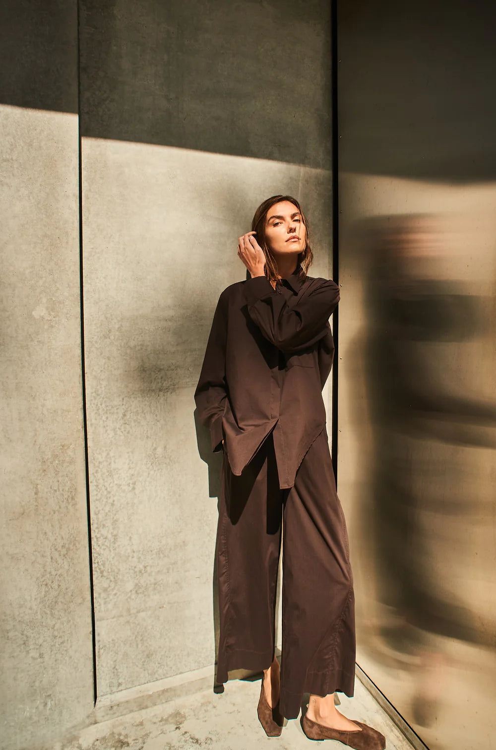 Crafted in Mela Purdie's Lightweight Microprene, A crisp, cotton rich fabric with high stretch and a polished finish. The Wide Cross Pant features barrel shaped panel seams in a wide leg silhouette.