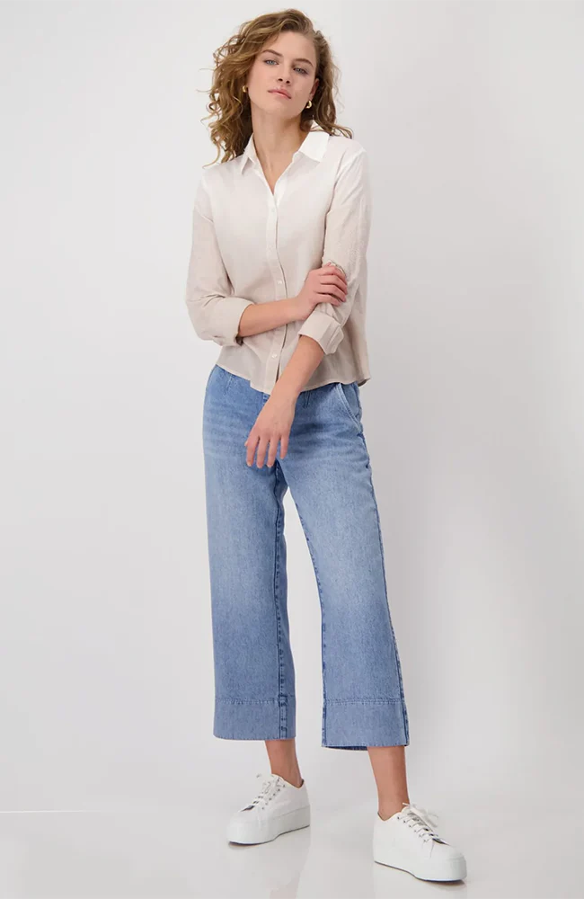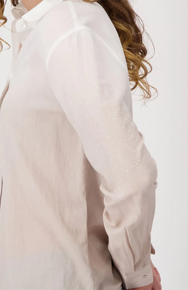The Monari 409132 Jewel Crystal Batik Style Detailing Blouse in Warm Sand is a refined and elegant wardrobe staple with a unique twist. Crafted from soft, breathable fabric, this blouse features exquisite crystal embellishments arranged in a batik-style pattern on the sleeves, adding a subtle yet sophisticated sparkle. The warm sand hue offers a timeless and versatile look, while the relaxed fit ensures effortless comfort and style. Perfect for both casual and dressier occasions, this blouse brings a touch of glamour to any outfit.