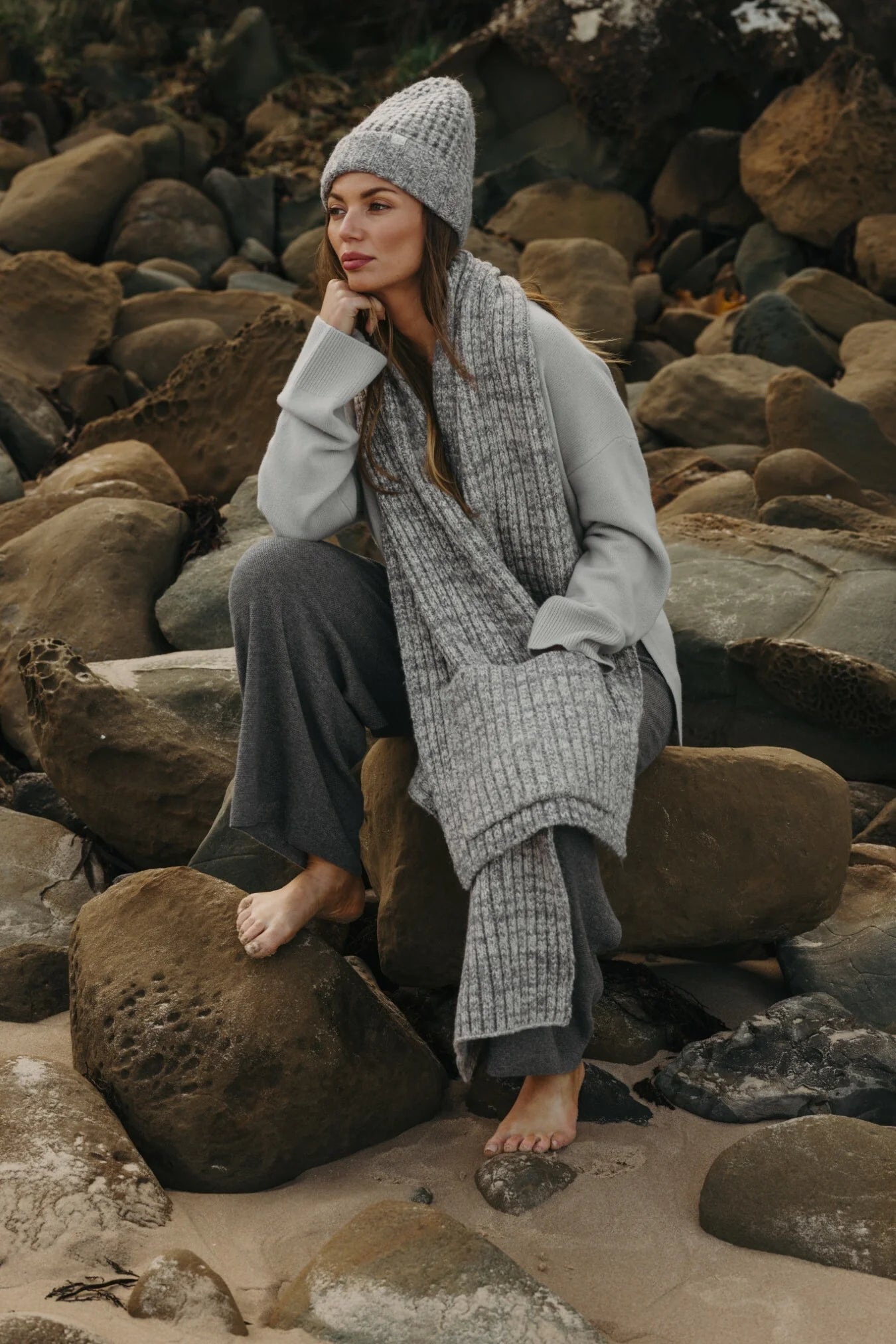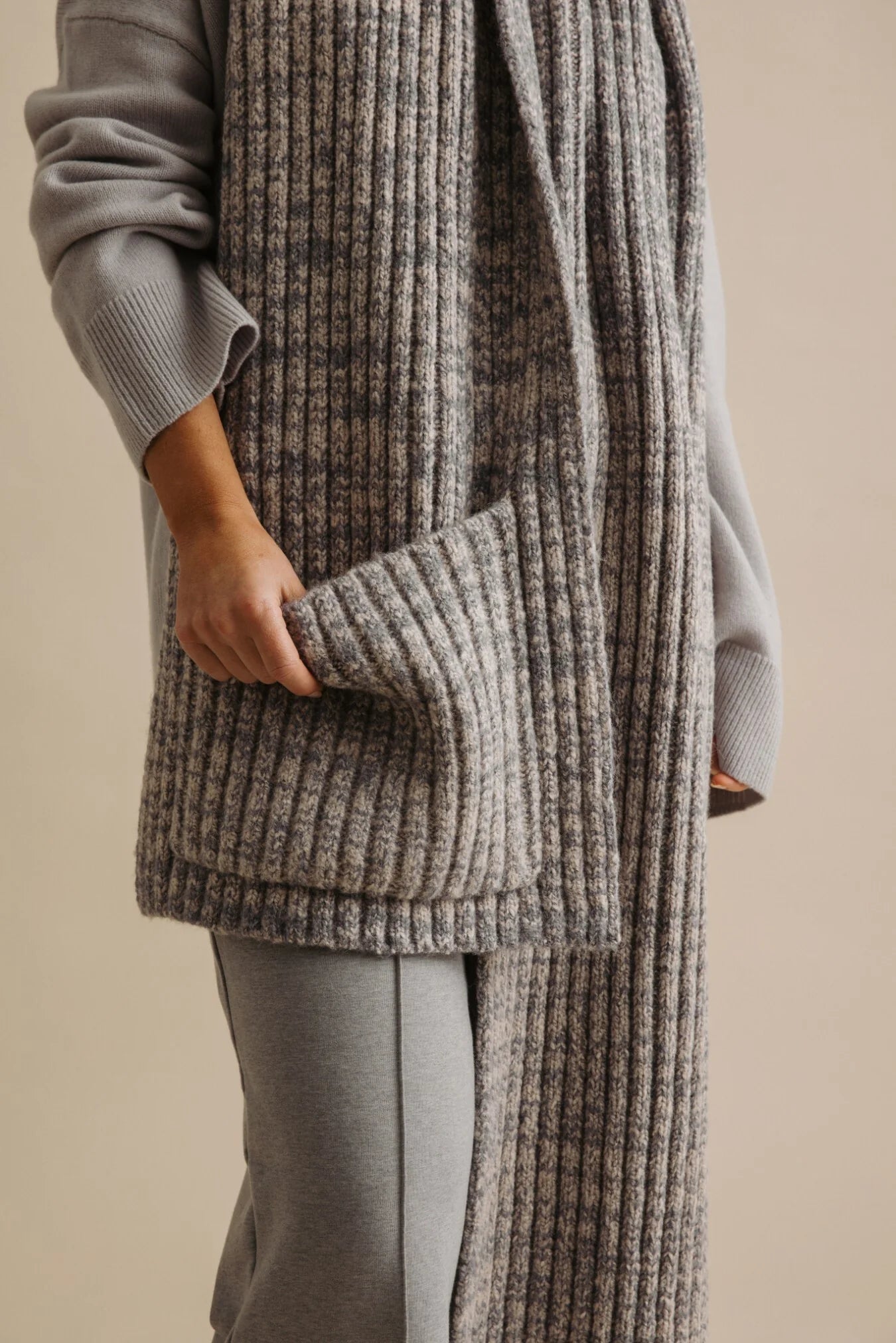 Knitted in two colours with a 2x2 rib, it has a subtle twist that catches the eye. A hidden pocket offers a practical touch — perfect for warming your hands on a cold winter’s day.